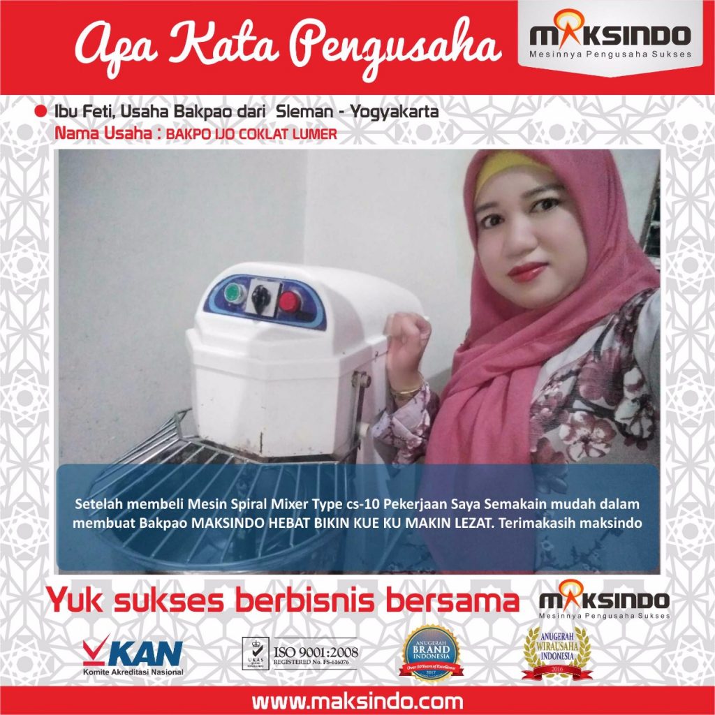 “Setelah membeli mesin mixer spiral type CS-10 pekerjaan saya semakin mudah dalam membuat bakpao MAKSINDO HEBAT BIKIN KUE MAKIN LEZAT. Terima Kasih Maksindo.
