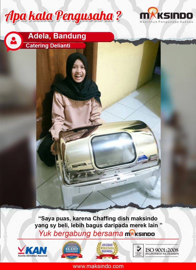 Ibu Adelia merupakan salah satu seorang pengusaha catering yang ada di Kota Bandung. Usaha catering yang diberi nama “catering delianti ” ini dalam mendukung proses produksinya menggunakan mesin usaha dari Maksindo. Salah satu mesin usaha yang digunakan adalah mesin chaffing dish. Ibu Adelia merasa puas dengan adanya mesin ini karena mesin ini sangat membantu proses produksi makanan untuk cateringnya .