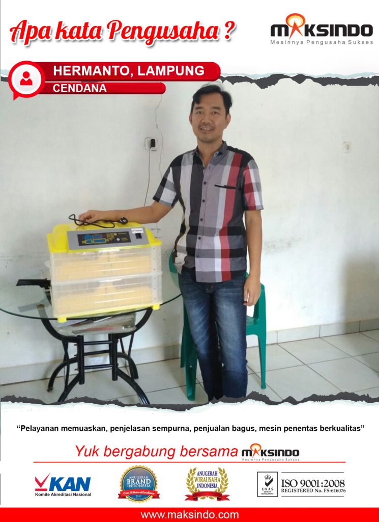 “Pelayanan semakin memuaskan, penjelasan sempurna, penjualan bagus, mesin penetas berkualitas”, kata Bapak Hermanto kepada team Maksindo.