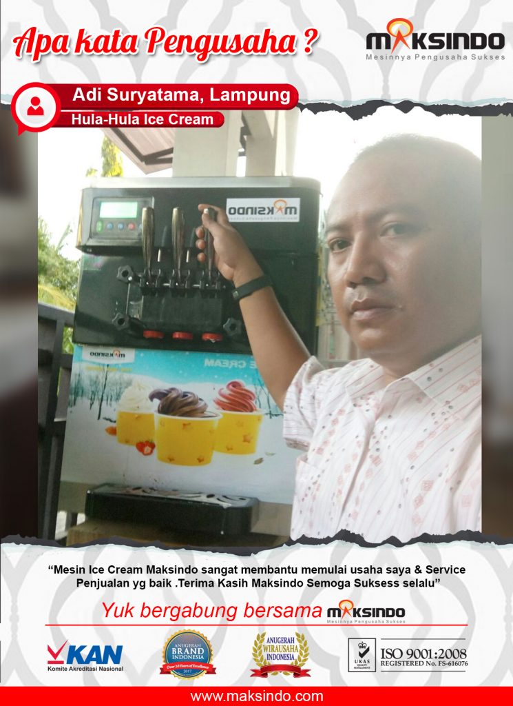 Mesin ice cream memang banyak dipilih oleh calon pengusaha, salah satunya Adi Suryatama asal Lampung. Beliau memiliki usaha dengan brand ” Hula-Hula Ice Cream”.