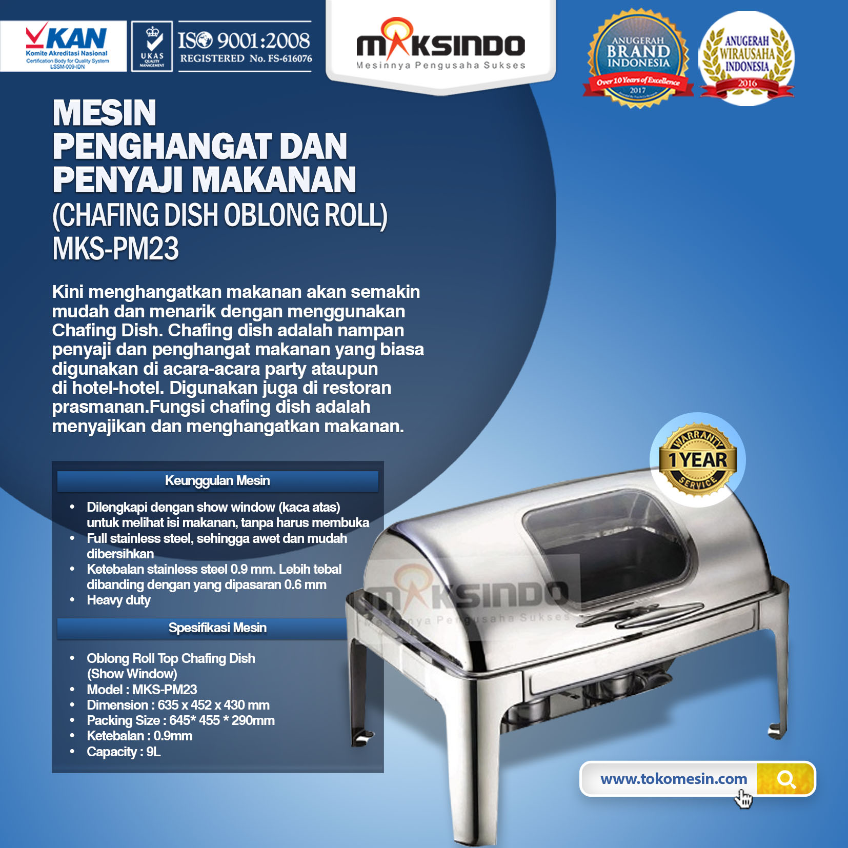 Maksindo menyediakan chafing dish bentuk oblong roll top. Chafing dish ini dilengkapi dengan kaca di atas yang fungsinya untuk melihat isi. Sehingga tidak perlu membuka tutup untuk sekedar melihat isi
