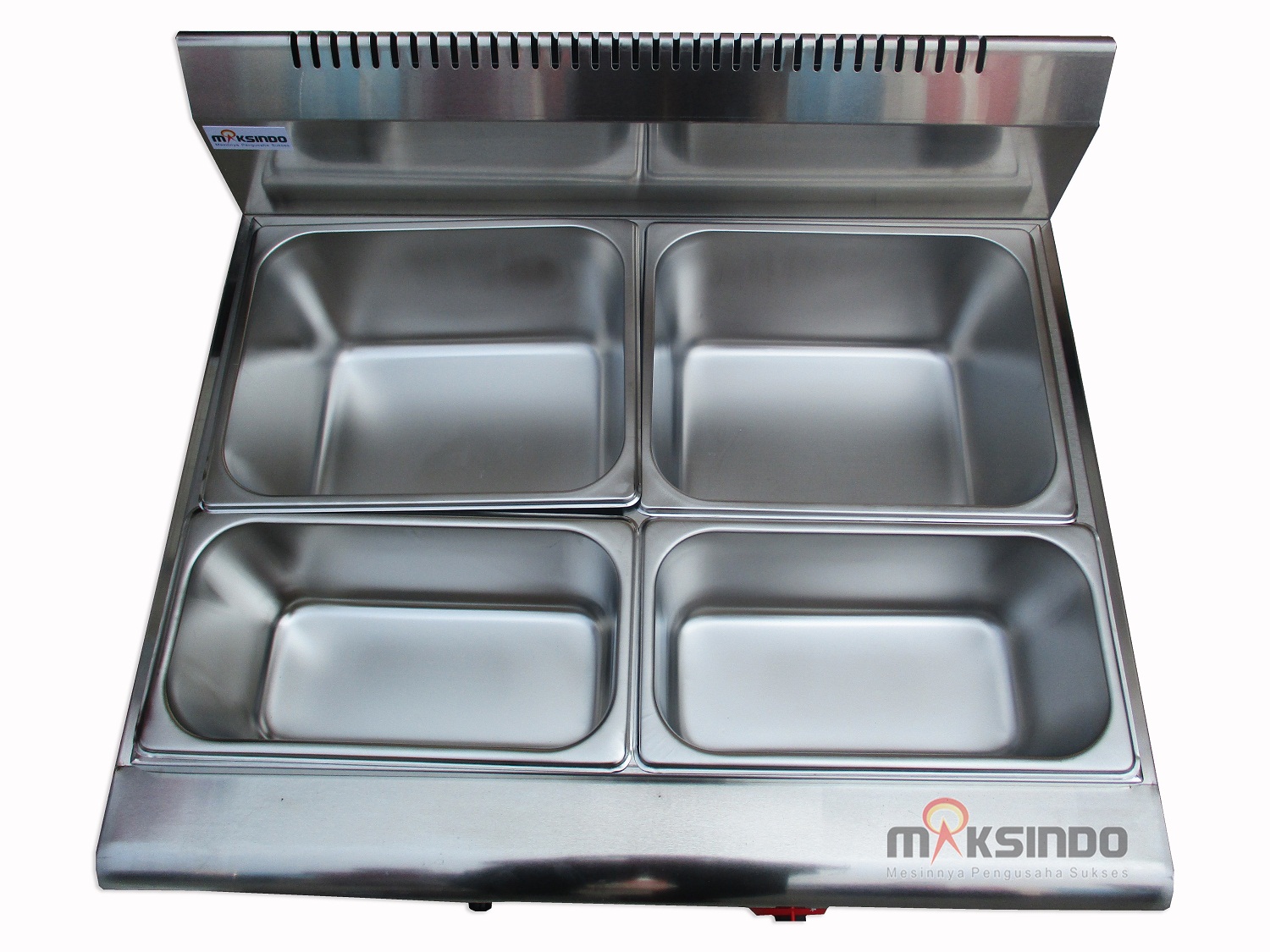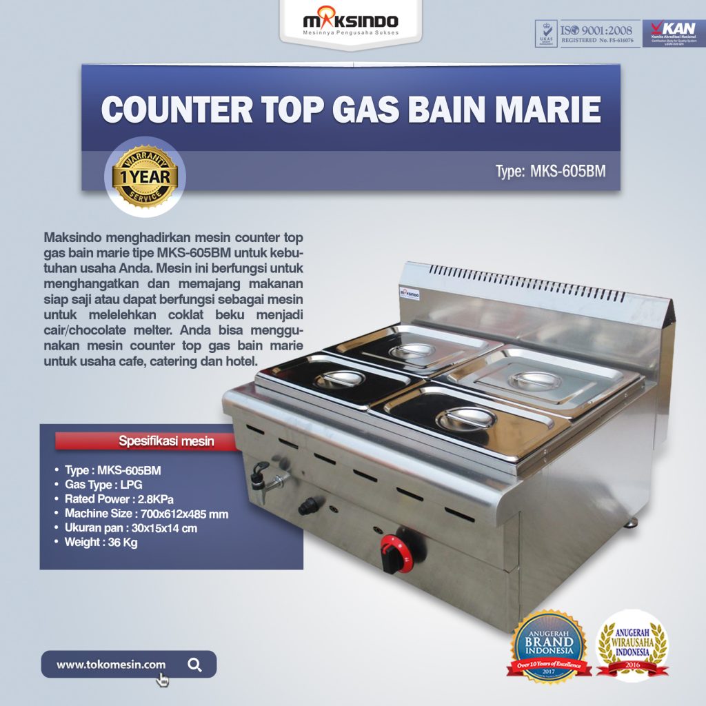 Maksindo menghadirkan mesin counter top gas bain marie tipe MKS-605BM untuk kebutuhan usaha Anda. Mesin ini berfungsi untuk menghangatkan dan memajang makanan siap saji atau dapat berfungsi sebagai mesin untuk melelehkan coklat beku menjadi cair/chocolate melter. Anda bisa menggunakan mesin counter top gas bain marie untuk usaha cafe, catering dan hotel.