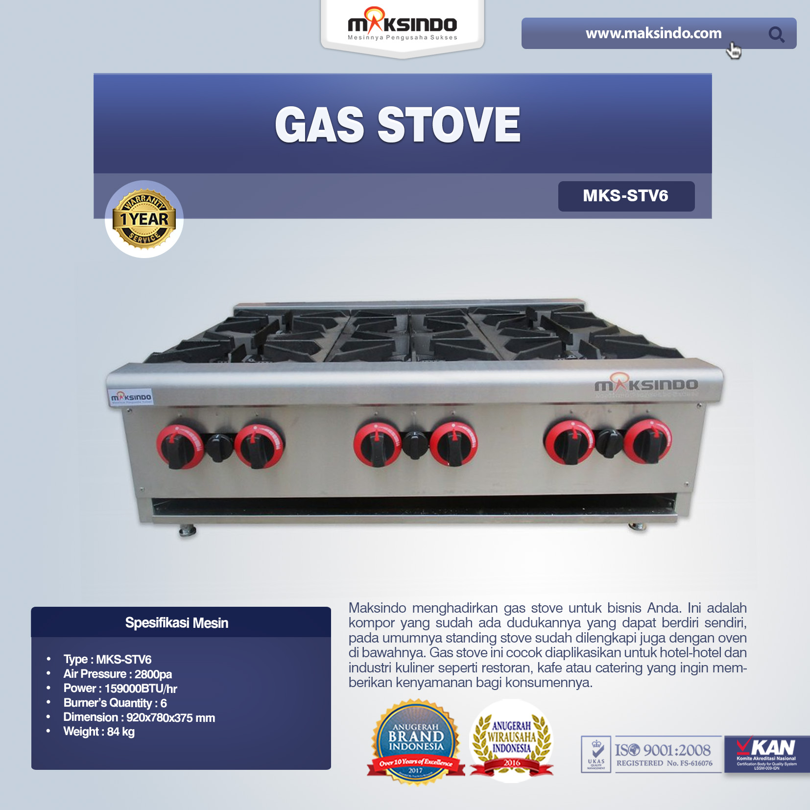 Anda memerlukan yang namanya gas stove.  Mesin Gas Stove ini bisa Anda manfaatkan sebagai kompor untuk kemudahan memasak sajian kuliner. Kompor dengan tekanan tinggi ini dapat dimanfaatkan untuk meningkatkan nilai komersialisasi dan juga meningkatkan keuntungan pemilik usaha dalam usaha kuliner Anda. Untuk investasi mesin dalam perabot alat masak Anda, juga sangat bagus jika menggunakan Gas Stove. Toko mesin maksindo saat ini menghadirkan mesin gas stove dengan type (MKS-STV6), yang mana mesin ini memiliki berat sekitar 84 kg dan memiliki mutu yang handal.