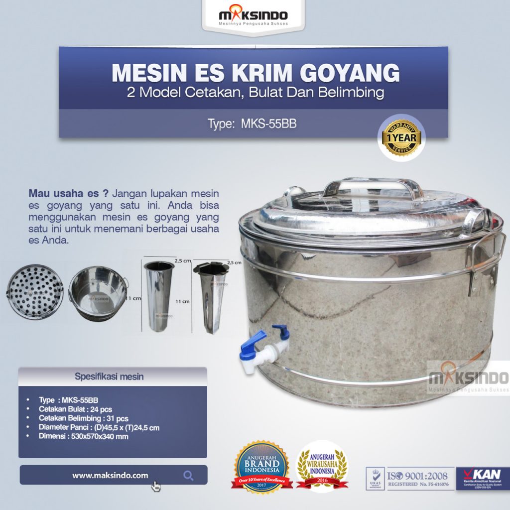 Jual Mesin Es Krim Goyang MKS-55BB di Semarang maksindoblitar July 31, 2018 Mesin Es Batu Mau usaha es ? Jangan lupakan mesin es goyang yang satu ini. Anda bisa menggunakan mesin es goyang yang satu ini untuk menemani berbagai usaha es Anda. Spesisikasi Es Krim Goyang (2 Model Cetakan, Bulat Dan Belimbing) Type : MKS-55BB Cetakan Bulat : 24 pcs Cetakan Belimbing : 31 pcs Diameter Panci : (D)45,5 x (T)24,5 cm Dimensi : 530x570x340 mm Harga : Rp 1.930.000 Jual Mesin Es Krim Goyang MKS-55BB di Semarang