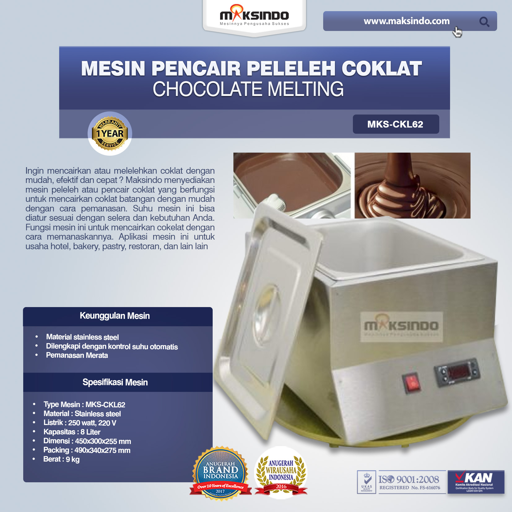 Spesifikasi Mesin Pencair / pemanas coklat ini adalah