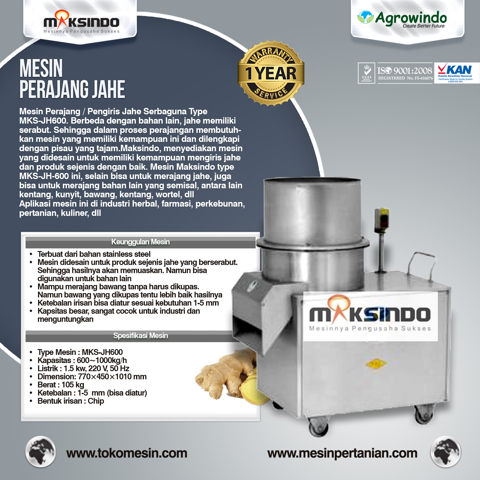 Maksindo, menyediakan mesin yang didesain untuk memiliki kemampuan mengiris jahe dan produk sejenis dengan baik. Mesin Maksindo type MKS-JH-600 ini, selain bisa untuk merajang jahe, juga bisa untuk merajang bahan lain yang semisal, antara lain kentang, kunyit, bawang, kentang, wortel, dll