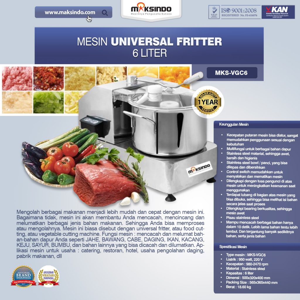 Anda ingin mengolah berbagai makanan yang lebih mudah dan mudah? Anda dapat memakai mesin universal fritter ini. Mesin universal fritter ini memiliki fungsi untuk mencacah, mencincang dan melumatkan bermacam jenis bahan makanan. Dengan adanya mesin ini maka Anda dapat langsung memproses atau mengolahnya. Jika Anda sedang mencari mesin universal fritter yang terbaik kini sudah ada di Toko Mesin Maksindo. Salah satu mesin universal fritter yang ada di Maksindo ialah dengan type VGc6. Fungsi mesin : mencacah dan melumat bahan-bahan dapur