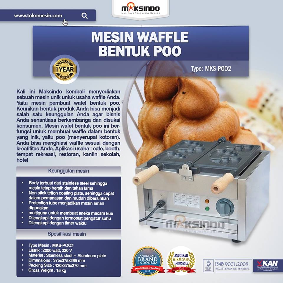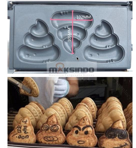 Kali ini Maksindo kembali menyediakan sebuah mesin unik untuk usaha waffle Anda. Yaitu mesin pembuat wafel bentuk poo. Keunikan bentuk produk Anda bisa menjadi salah satu keunggulan Anda agar bisnis Anda senantiasa berkembanga dan disukai konsumen