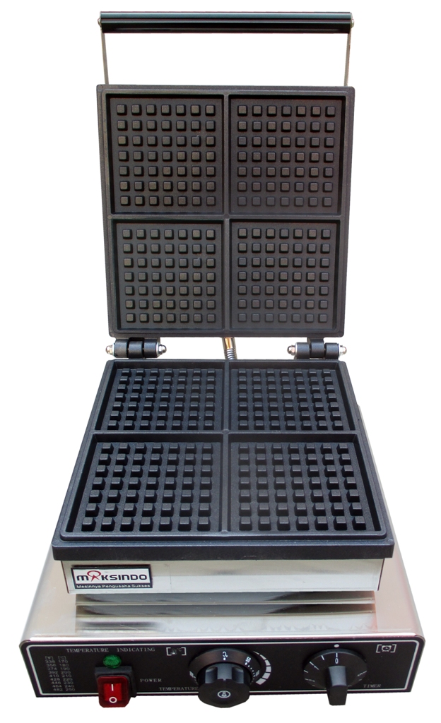 Membuat waffle semain mudah dengan menggunakan mesin pembuat waffle bentuk kotak type WFA04 Maksindo ini. Mesin ini terdiri dari 4 kotak waffle (head), ukuran sedang. Sekali proses, Anda bisa membuat 4 buah kue wafel.