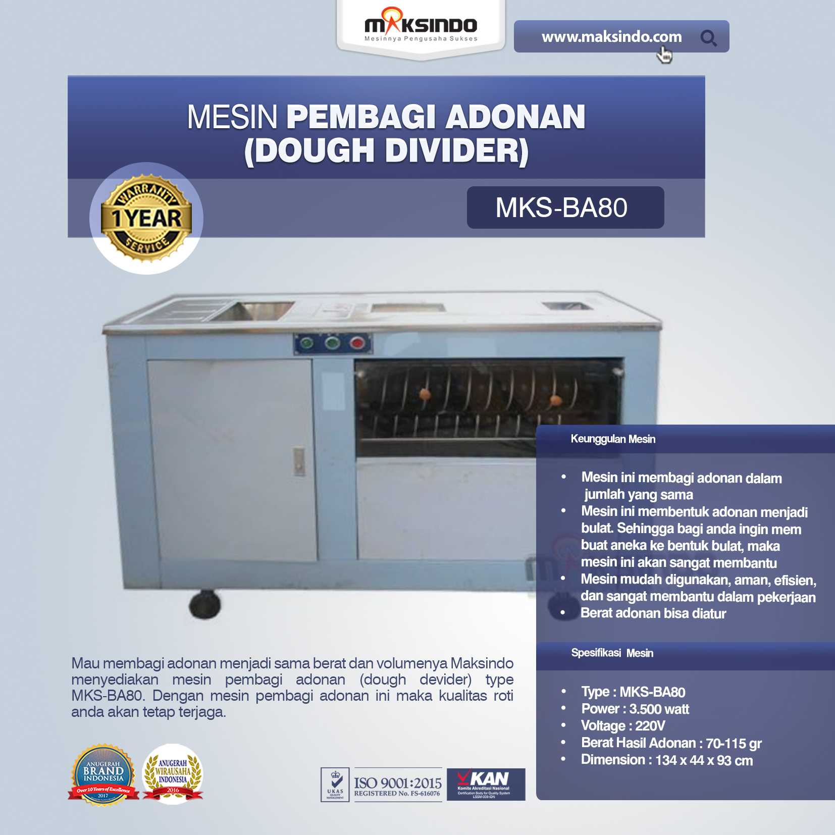 Sekian beberapat informasi mengenai mesin pembagi adonan dengan type MKS-BA80 yang dapat dipakai untuk membantu saat proses pembagian adonan bulat dengan cara yang mudah.Bila Anda tertarik untuk memakai mesin ini Anda dapat mendapatkannya hanya di Toko Mesin Maksindo yang ada di Kota Anda.