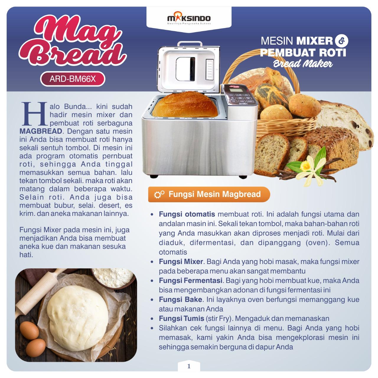 Halo bunda… kini sudah hadir mesin mixer dan pembuat roti serbaguna MAGBREAD. Dengan satu mesin ini Anda bisa membuat roti hanya sekali sentuh tombol. Di mesin ini ada program otomatis pembuat roti, sehingga Anda tinggal memasukkan semua bahan, lalu tekan tombol sekali, maka roti akan matang dalam beberapa waktu. Selain roti, Anda juga bisa membuat bubur, selai, desert, es krim, dan aneka makanan lainnya.