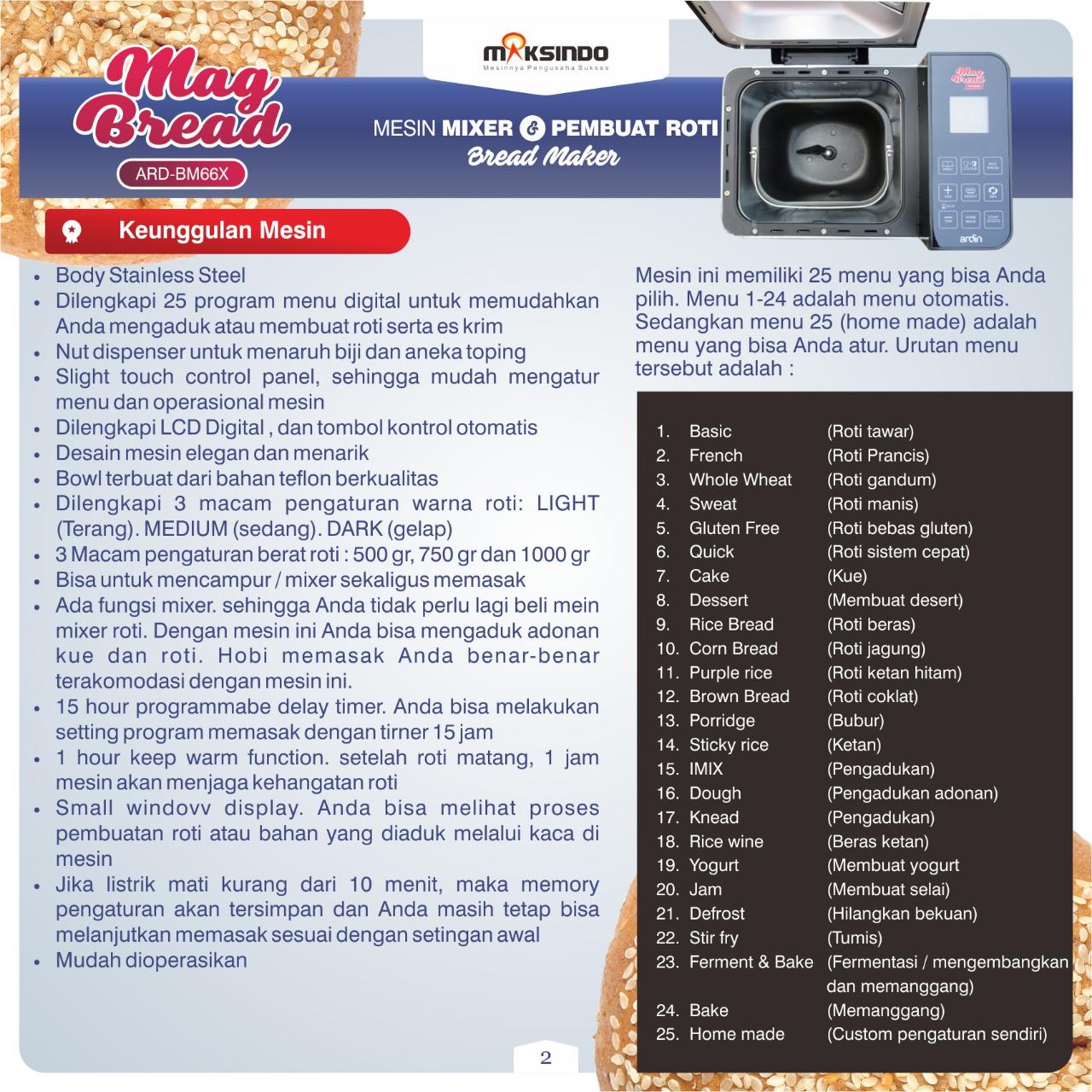 - Dilengkapi 25 program menu digital untuk memudahkan Anda mengaduk atau membuat roti serta es krim