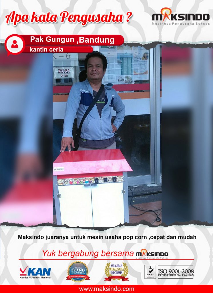 Mesin pembuat popcorn dari Maksindo telah digunakan oleh banyak kalangan pengusaha salah satunya ialah Bapak Gungun dari Bandung. Membeli mesin pembuat popcorn untuk menjalankan usaha kantin dengan nama “Kantin Ceria”