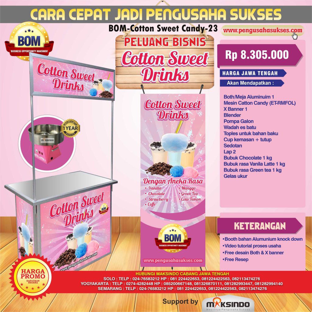 Mari bergabung dan ambil peluang bisnis opportunity Maksindo paket usaha Sweet Cotton Candi Dengan biaya Rp 8.305.000  Anda akan langsung siap buka usaha Sweet Cotton Candi. Dengan kelengkapan both, mesin, video tutorial, bahan baku pertama, dll. Adapun penawaran  menarik ini bisa Anda lihat selengkapnya di bawah ini :