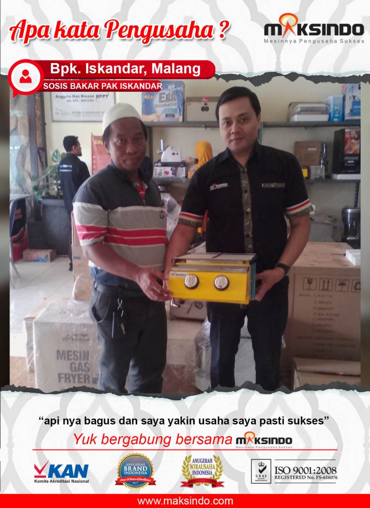 Mesin pemanggang bbq memang tepat sekali membantu usaha Anda. Dimana mesin ini memiliki kinerja yang handal sehingga mampu memudahkan berlangsungnya pemanggangan makanan. Salah satu pengusaha yang mempercayakan mesin kami ialah Bapak Iskandar dari Malang. Beliau ini menggunakan mesin pemanggang untuk memudahkan usaha yang dijalaninya. Beliau memiliki usaha dengan nama “Sosis Bakar Pak Iskandar”.