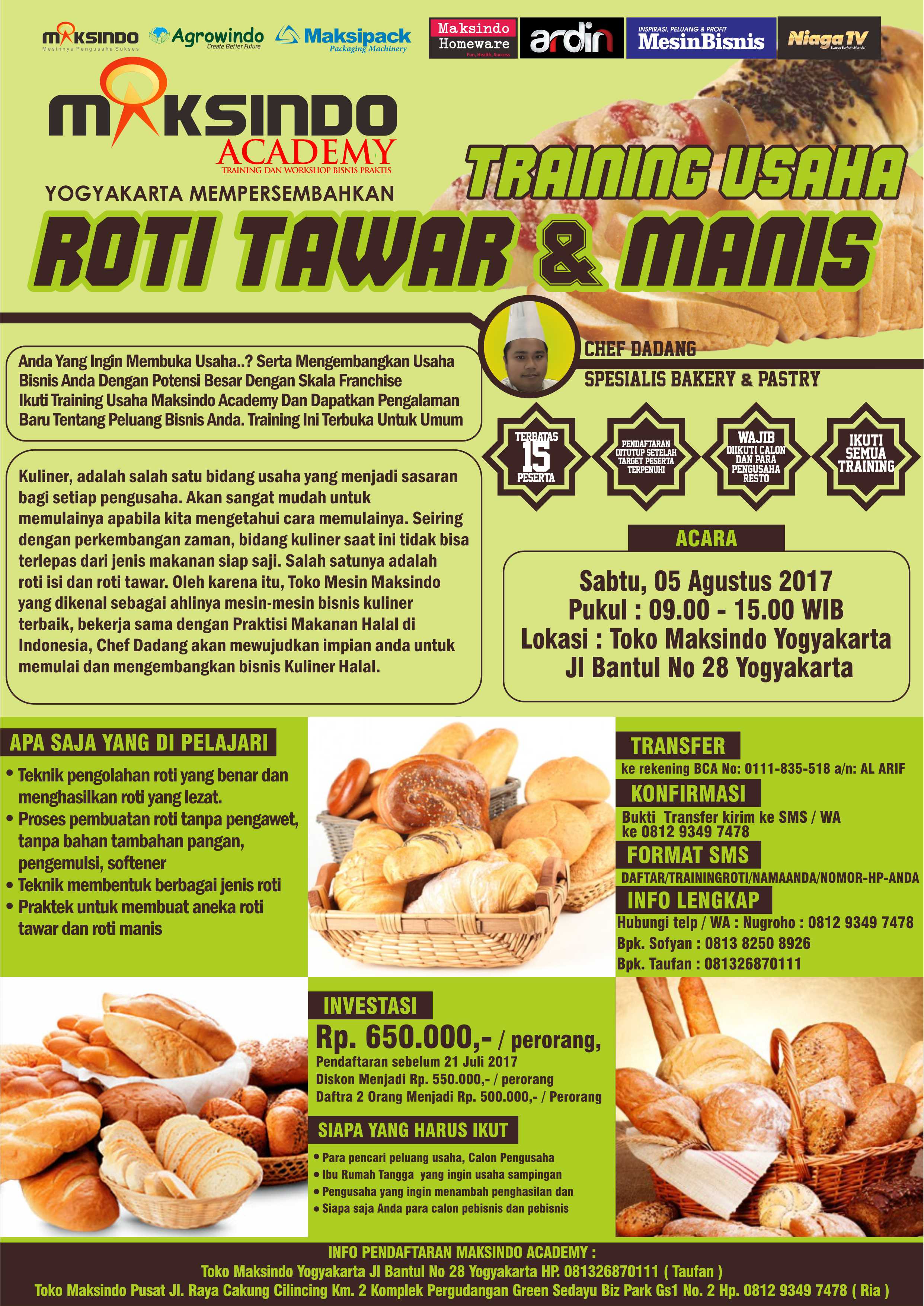 Kuliner, adalah salah satu bidang usaha yang menjadi sasaran bagi setiap pengusaha. Akan sangat mudah untuk memulainya apabila kita mengetahui cara memulainya. Seiring dengan perkembangan zaman, bidang kuliner saat ini tidak bisa terlepas dari jenis makanan siap saji. Salah satunya adalah roti isi dan roti tawar. Oleh karena itu, Toko Mesin Maksindo yang dikenal sebagai ahlinya mesin-mesin bisnis kuliner terbaik, bekerja sama dengan Praktisi Makanan Halal di Indonesia, Chef Dadang akan mewujudkan impian anda untuk memulai dan mengembangkan bisnis Kuliner Halal.