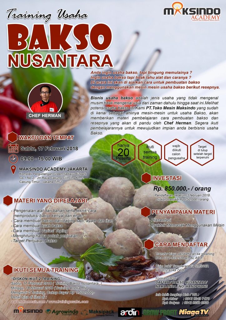 Di acara ini akan di ajarkan cara untuk pembuatan bakso dengan menggunakan mesin mesin usaha bakso berikut resepnya. Bisnis usaha bakso adalah jenis usaha yang tidak mengenal musim,tidak mengenal usia dari zaman dahulu hingga saat ini.Melihat potensi usaha bakso ini Kami PT.Toko Mesin Maksindo yang sudah di kenal sebagai ahlinya mesin-mesin untuk usaha Bakso, akan memberikan materi pembelajaran cara pembuatan bakso dan resepnya yang akan di pandu oleh Chef Herman. Segera ikuti pembelajarannya untuk mewujudkan impian anda berbisnis usaha Bakso.