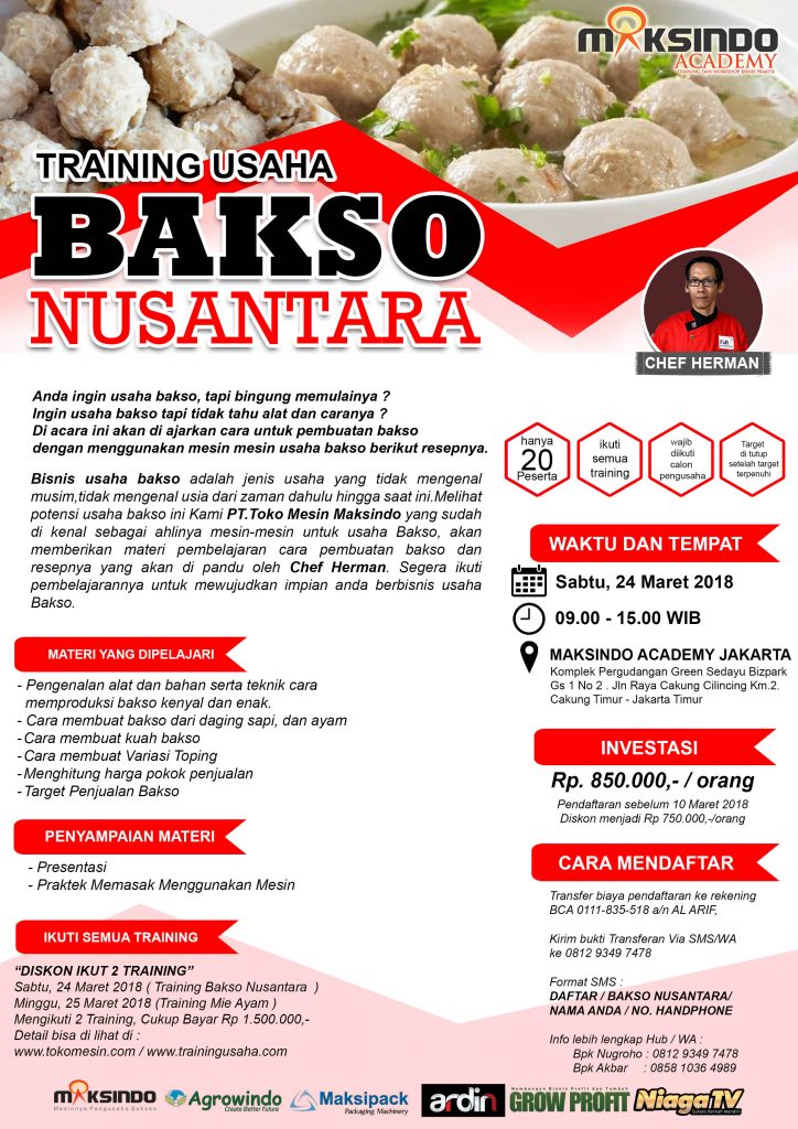 Bisnis usaha bakso adalah jenis usaha yang tidak mengenal musim,tidak mengenal usia dari zaman dahulu hingga saat ini.Melihat potensi usaha bakso ini Kami PT.Toko Mesin Maksindo yang sudah di kenal sebagai ahlinya mesin-mesin untuk usaha Bakso, akan memberikan materi pembelajaran cara pembuatan bakso dan resepnya yang akan di pandu oleh Chef Herman. Segera ikuti pembelajarannya untuk mewujudkan impian anda berbisnis usaha Bakso.