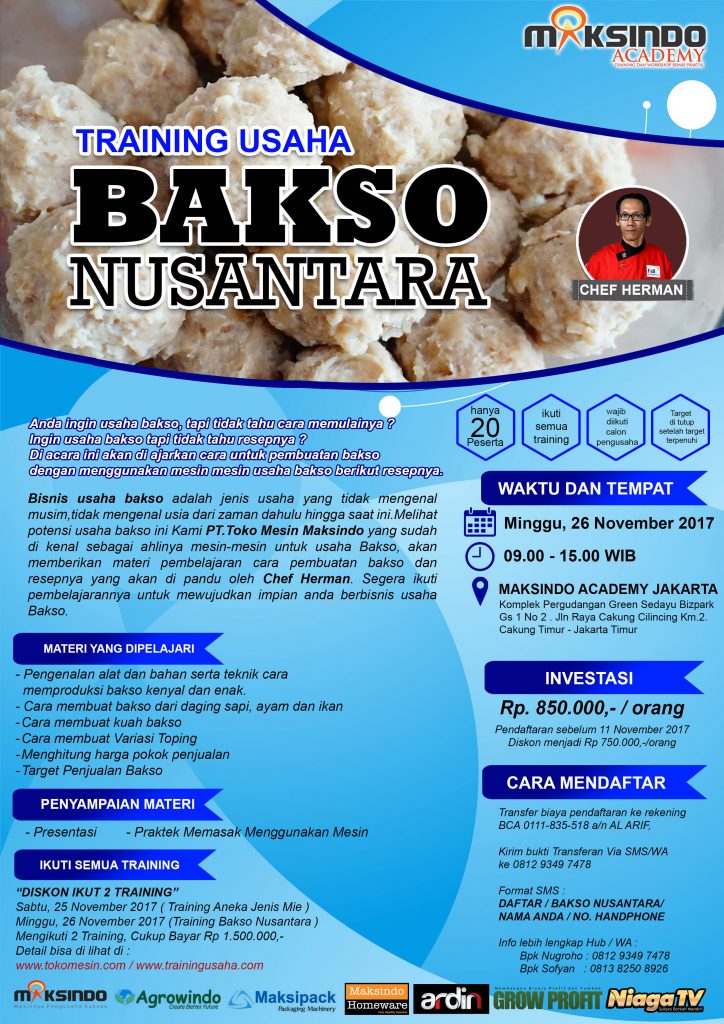 Bisnis usaha bakso adalah jenis usaha yang tidak mengenal musim, tidak mengenal usia dari zaman dahulu hingga saat ini.Melihat potensi usaha bakso ini Kami PT.Toko Mesin Maksindo yang sudah di kenal sebagai ahlinya mesin-mesin untuk usaha Bakso,akan memberikan materi pembelajaran cara pembuatan bakso dan resepnya yang akan di pandu oleh Chef Herman. Segera ikuti pembelajarannya untuk mewujudkan impian anda berbisnis usaha Bakso.