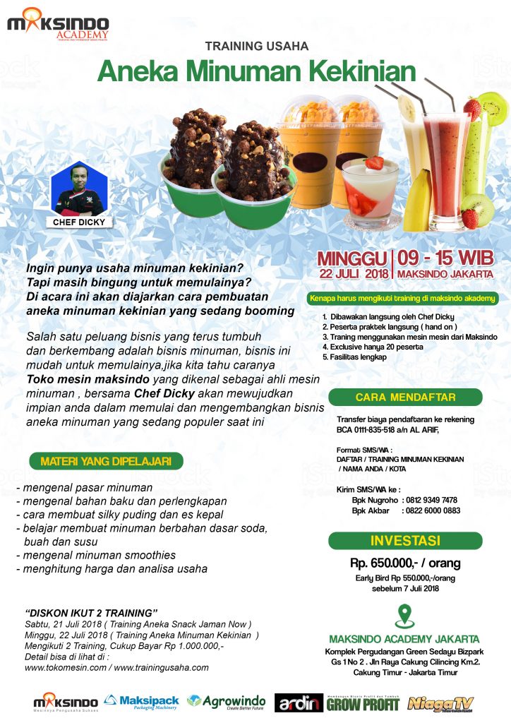 Salah satu peluang bisnis yang terus tumbuh dan berkembang adalah bisnis minuman, bisnis ini mudah untuk memulainya, jika kita tahu caranya Toko Mesin Maksindo yang dikenal sebagai ahli mesin minuman, bersama Chef Dicky akan mewujudkan impian anda dalam memulai dan mengembangkan bisnis aneka minuman yang sedang populer saat ini.