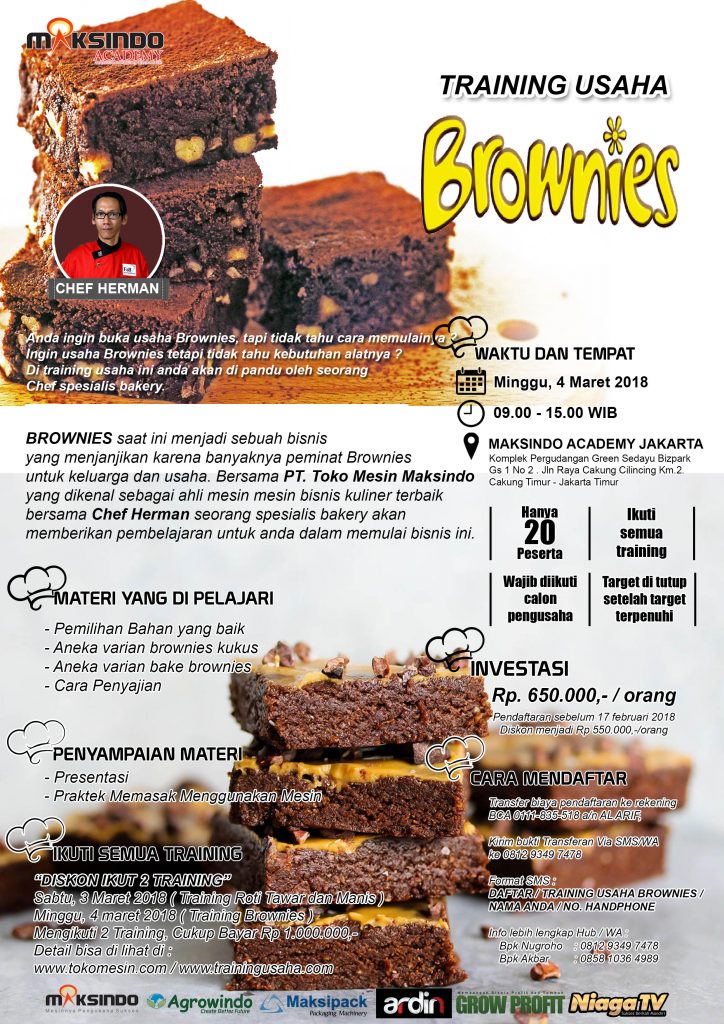 Anda ingin buka usaha Brownies, tapi tidak tahu cara memulainya ? Ingin usaha Brownies tetapi tidak tahu kebutuhan alatnya ? Di training usaha ini anda akan di pandu oleh seorang Chef spesialis bakery. BROWNIES saat ini menjadi sebuah bisnis yang menjanjikan karena banyaknya peminat Brownies untuk keluarga dan usaha. Bersama PT. Toko Mesin Maksindo yang dikenal sebagai ahli mesin mesin bisnis kuliner terbaik bersama Chef Herman seorang spesialis bakery akan memberikan pembelajaran untuk anda dalam memulai bisnis ini.