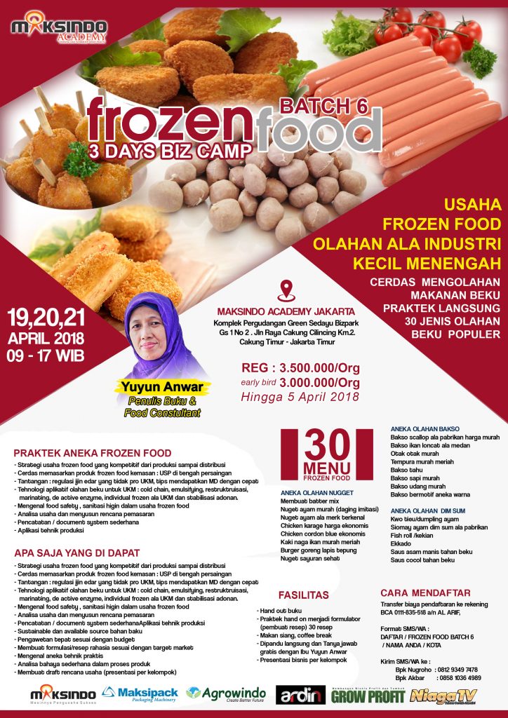 Ingin terjun di olahan produk beku sehingga bisa kompetitif dengan merk yang dipasaran ? Bingung mencari tehnologi yang tepat sesuai dengan budget minim agar produk mirip yang bermerk ? Tidak bisa mengendalikan mutu makanan yang dijual ? Semua tahu, olahan frozen food pasarnya luar biasa, pasar masa depan tapi pemainnya raksasa, belum tahu strategi nya ?