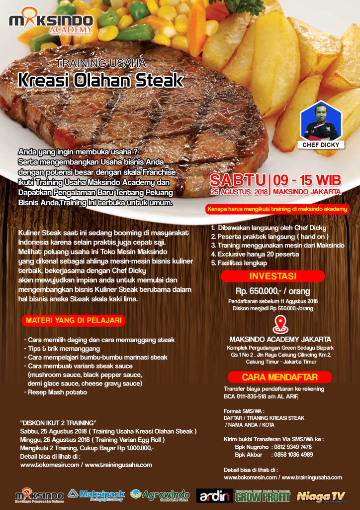 Anda yang ingin membuka usaha ? Serta mengembangkan Usaha bisnis Anda dengan potensi besar dengan skala Franchise ikuti Training Usaha Maksindo Academy dan Dapatkan Pengalaman Baru Tentang Peluang Bisnis Anda, Training ini terbuka untuk umum. Kuliner Steak saat ini sedang booming di masyarakat Indonesia karena selain praktis juga cepatsaji. Melihat peluang usaha ini Toko Mesin Maksindo yang dikenal sebagai ahlinya mesin-mesin bisnis kuliner terbaik, bekerjasama dengan Chef Dicky akan mewujudkan impian anda untuk memulai dan mengembangkan bisnis Kuliner Steak terutama dalam hal bisnis aneka Steak skala kaki lima.