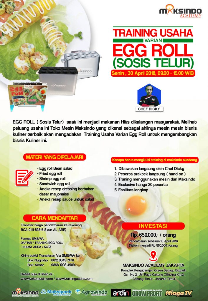 EGG ROLL ( Sosis Telur) saat ini menjadi makanan Hits dikalangan masyarakat, Melihat peluang usaha ini Toko Mesin Maksindo yang dikenal sebagai ahlinya mesin mesin bisnis kuliner terbaik akan mengadakan Training Usaha Varian Egg Roll untuk mengembangkan bisnis Kuliner ini.