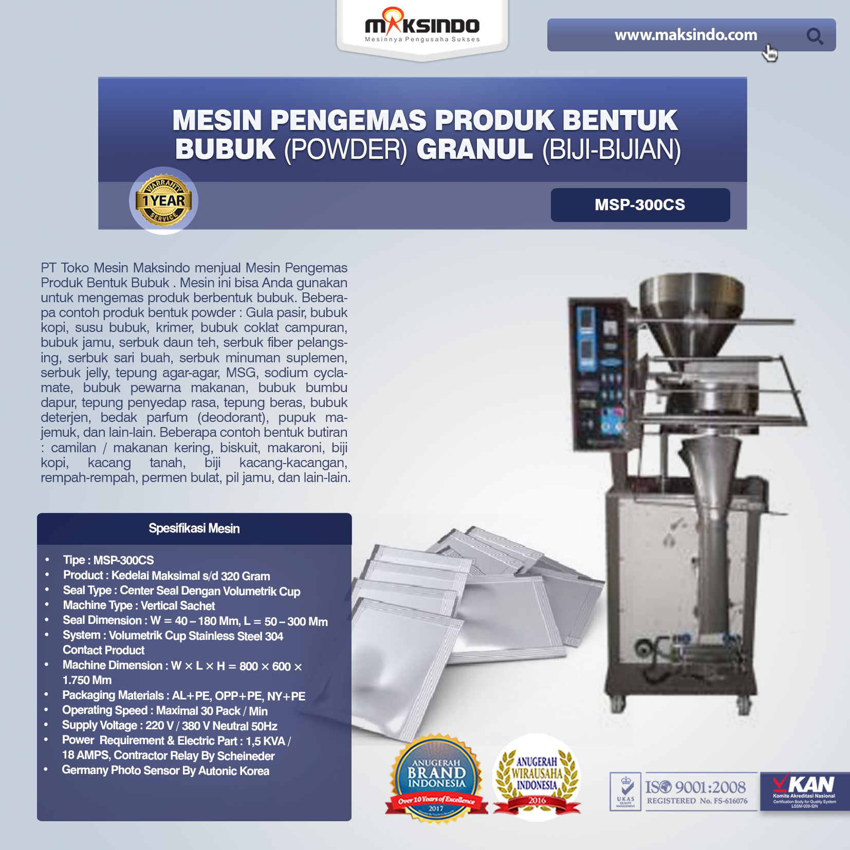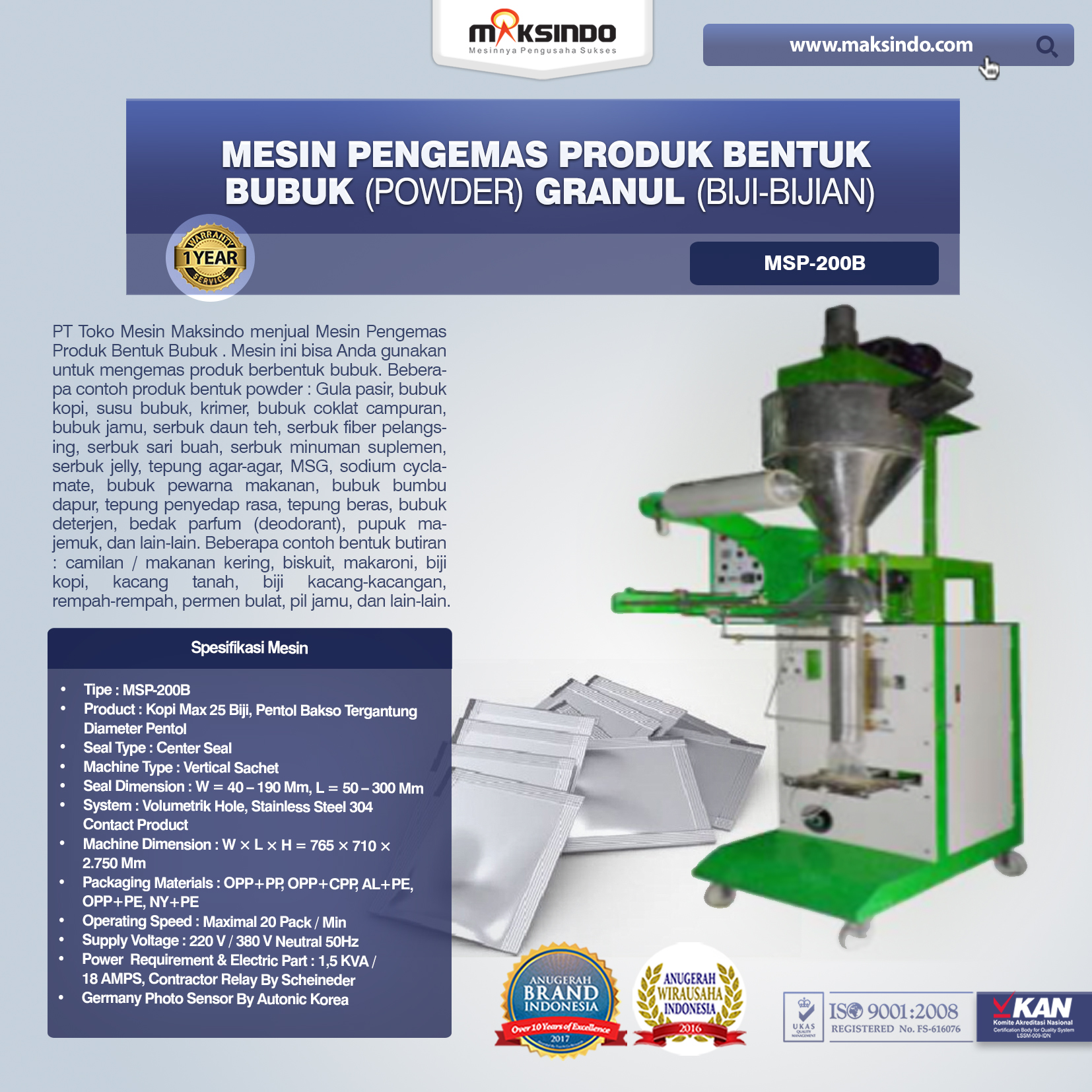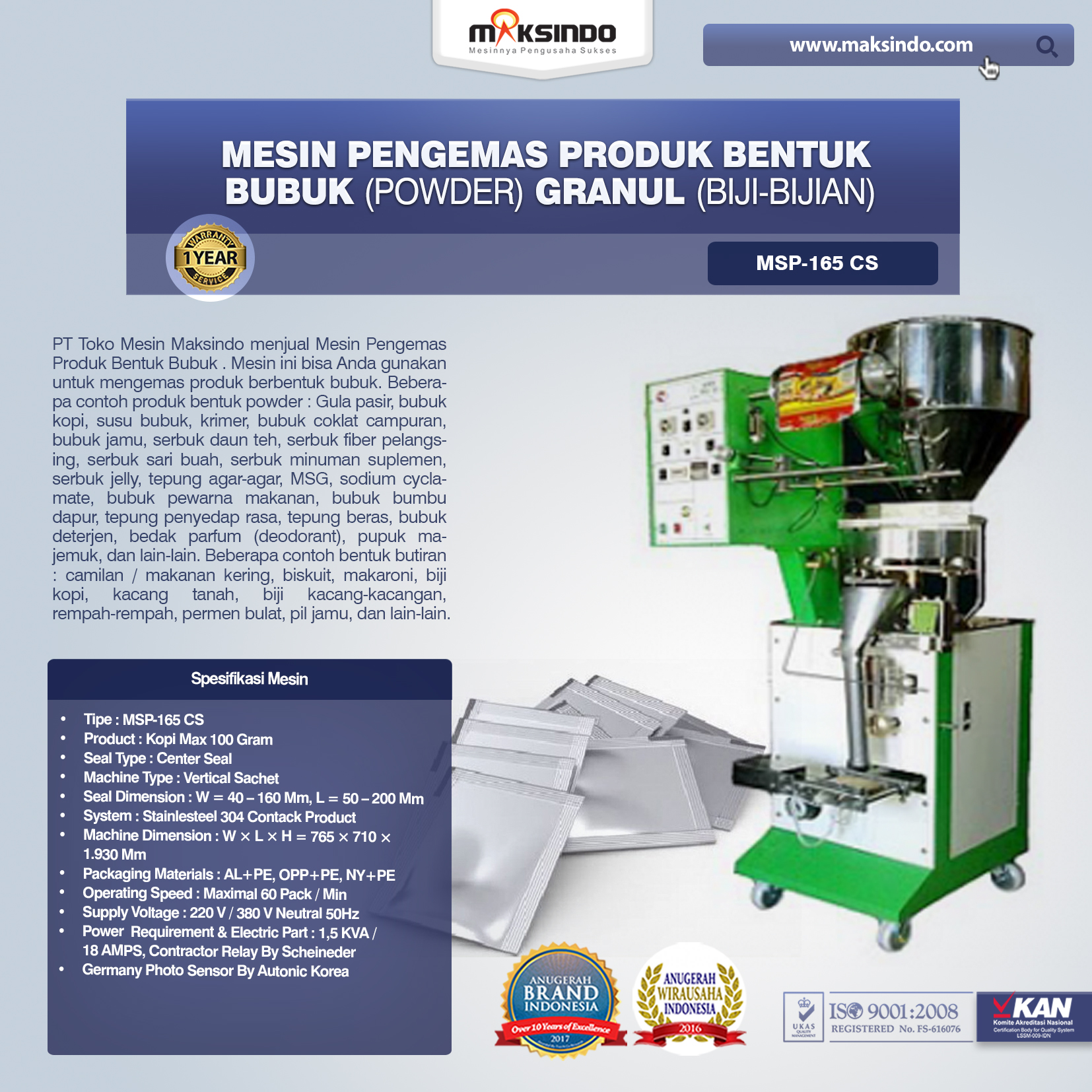 PT Toko Mesin Maksindo menjual Mesin Pengemas Produk Bentuk Bubuk . Mesin ini bisa Anda gunakan untuk mengemas produk berbentuk bubuk. Beberapa contoh produk bentuk powder : Gula pasir, bubuk kopi, susu bubuk, krimer, bubuk coklat campuran, bubuk jamu, serbuk daun teh, serbuk fiber pelangsing, serbuk sari buah, serbuk minuman suplemen, serbuk jelly, tepung agar-agar, MSG, sodium cyclamate, bubuk pewarna makanan, bubuk bumbu dapur, tepung penyedap rasa, tepung beras, bubuk deterjen, bedak parfum (deodorant), pupuk majemuk, dan lain-lain.